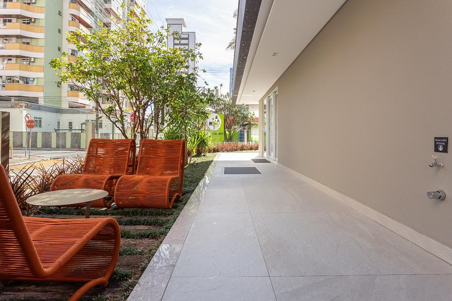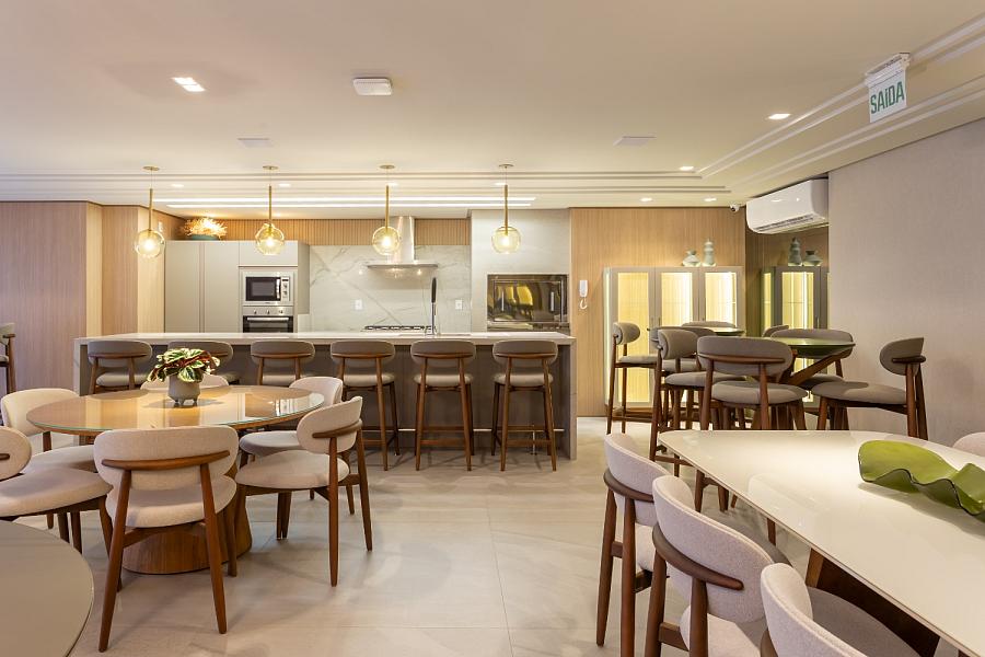 O condomínio conta com uma área de lazer e convivência mobiliada, decorada e climatizada.